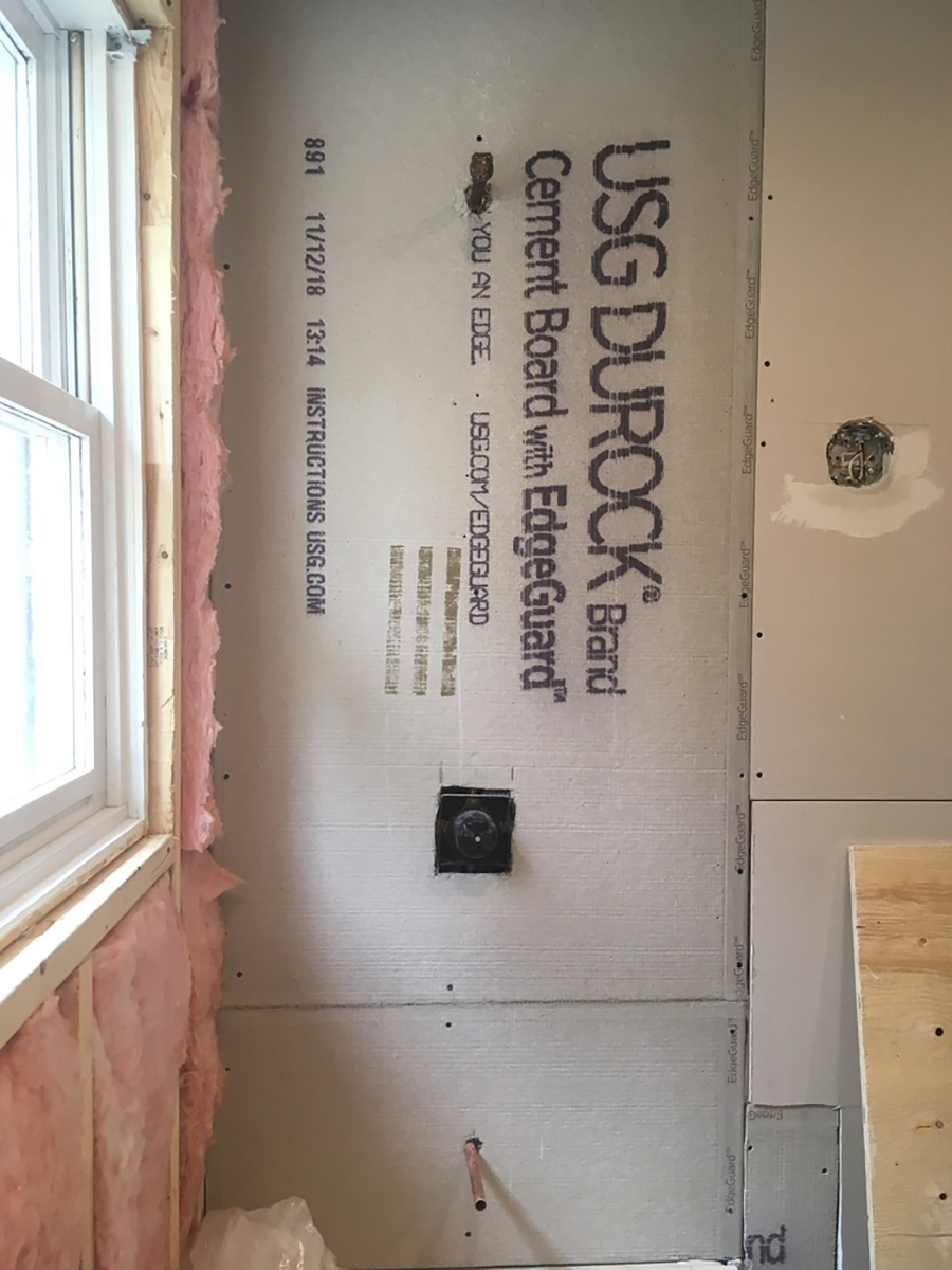tub, toilet, lighting, custom vanity and sink, Brizo matte black fixtures, RH metal medicine and apothecary cabinets, hexagonal multi patterned tiles, hand made artisinal walnut bath caddy, towels, mat