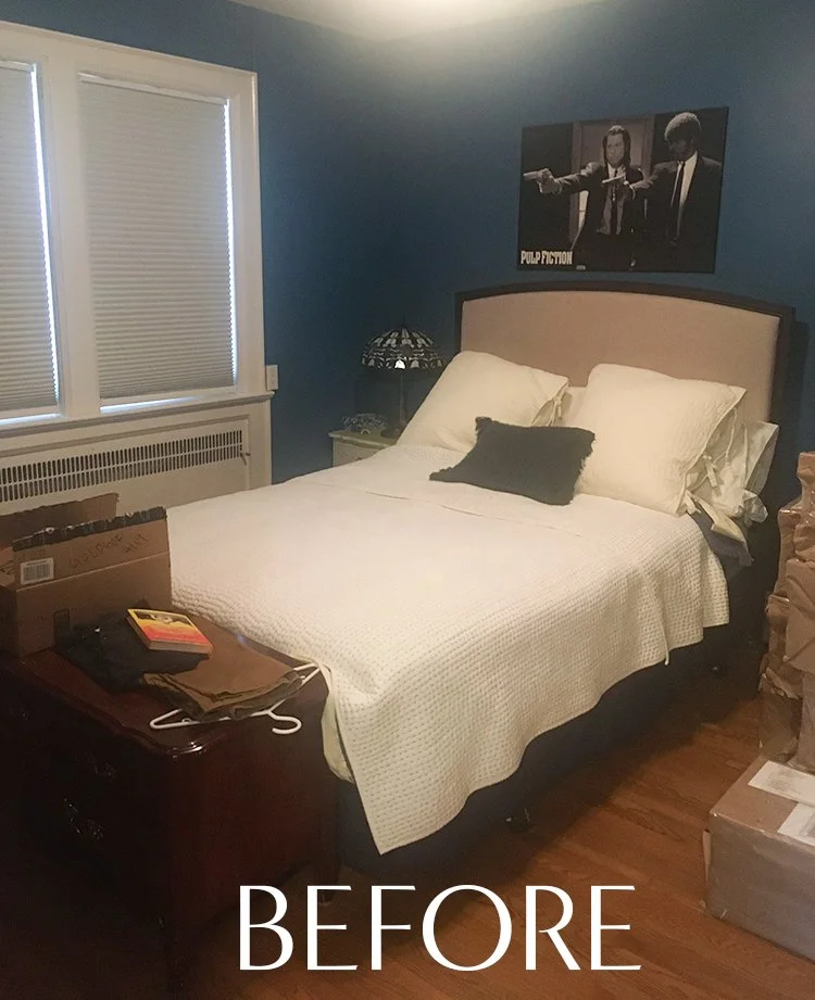 Painted ceiling, trim and doors, Papered the walls in a multi-toned blue faux grasscloth paper with silver highlights reminiscent of sunlight sparkling on the water, New wool carpet, New ceiling light, New bedside tables, New table lamps, New Crisp white and navy linen bedding with Navy embroidery accents, New Navy wooden dresser, New Gold framed circular mirror, New custom white cotton sailcloth drapes, New pastel matte glazed porcelain vases with dried grasses, New fouta towels, New soaps and room scent diffuser